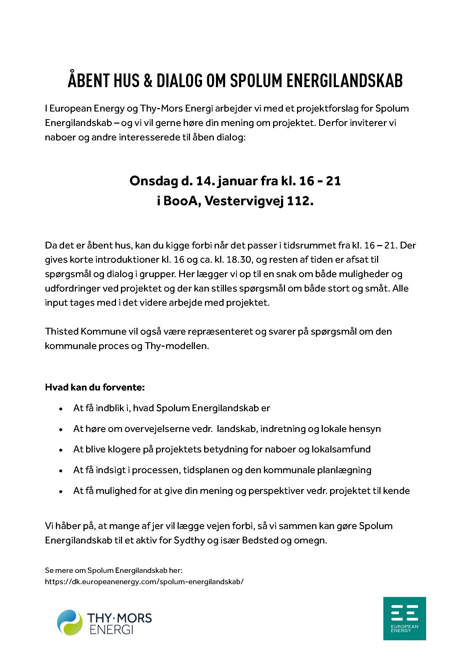 I European Energy og Thy-Mors Energi arbejder vi med et projektforslag for Spolum Energilandskab – og vi vil gerne høre din mening om projektet. Derfor inviterer vi naboer og andre interesserede til åben dialog