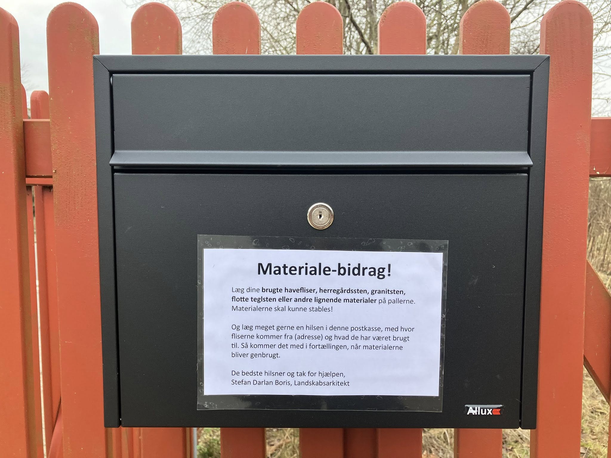 Har du et par fliser i overskud? Så donér dem meget gerne ved Ørhøj -den vilde have, hvor der er lagt nogle paller frem. Og skriv gerne et par linjer om hvor materialerne er fra i postkassen der er sat op ved pallerne.”