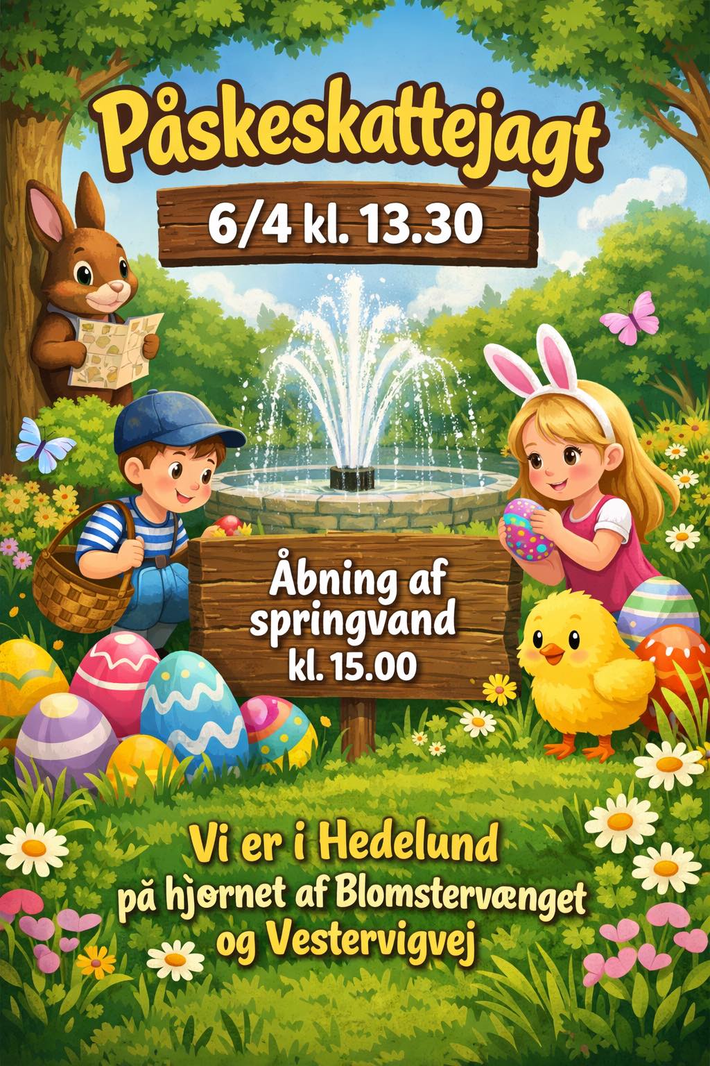 Vi starter Påskeskattejagten i Hedelund kl. 13:30. Find påskeæg rundt i byen.